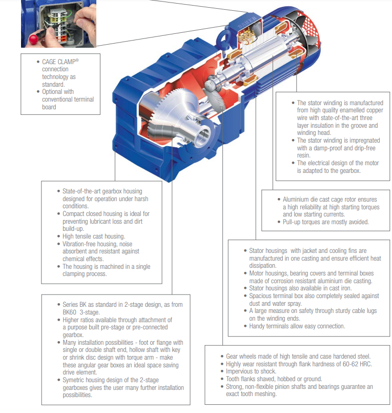 BG 系列減速電機是我們最暢銷和最經濟合算的產品,為可靠性與經濟性樹立了新標準,其中包括諸多無與倫比的標準功能與特點。逆變器友好型設計不僅可確保目前輕松集成,而且還能滿足未來需求。標配有確保與您的應用輕松集成的英制或公制尺寸輸出軸。BG 減速電機擁有靈活的安裝選件,包括支腳、基座、表面與法蘭解決方案。電機接線盒可以安裝在圍繞電機架旋轉 90° 的其他位置,實現無與倫比的